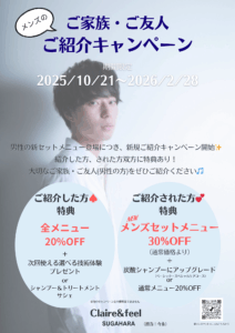 男性の新セットメニューを記念して、Claire&feel SUGAHARAではご紹介キャンペーンを始めます❣